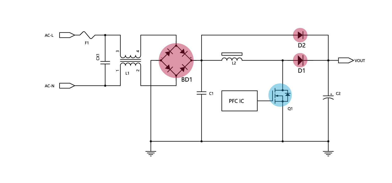 功率校正因數(shù)(PFC),是針對非正弦電流波形畸變而采取的, 迫使交流線路電流追蹤電壓波形的瞬時變化軌跡,并使電流和電壓保持同相位,解決了電流波形的校正,同時也解決了電壓、電流的同相問題并具有升壓的作用。