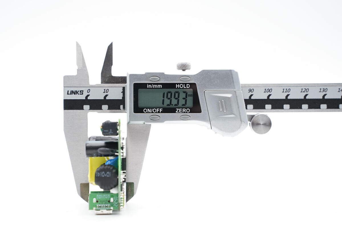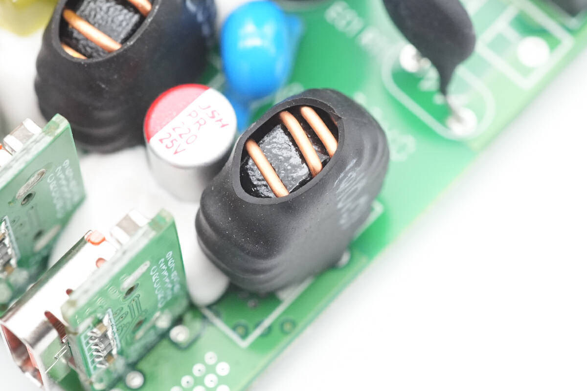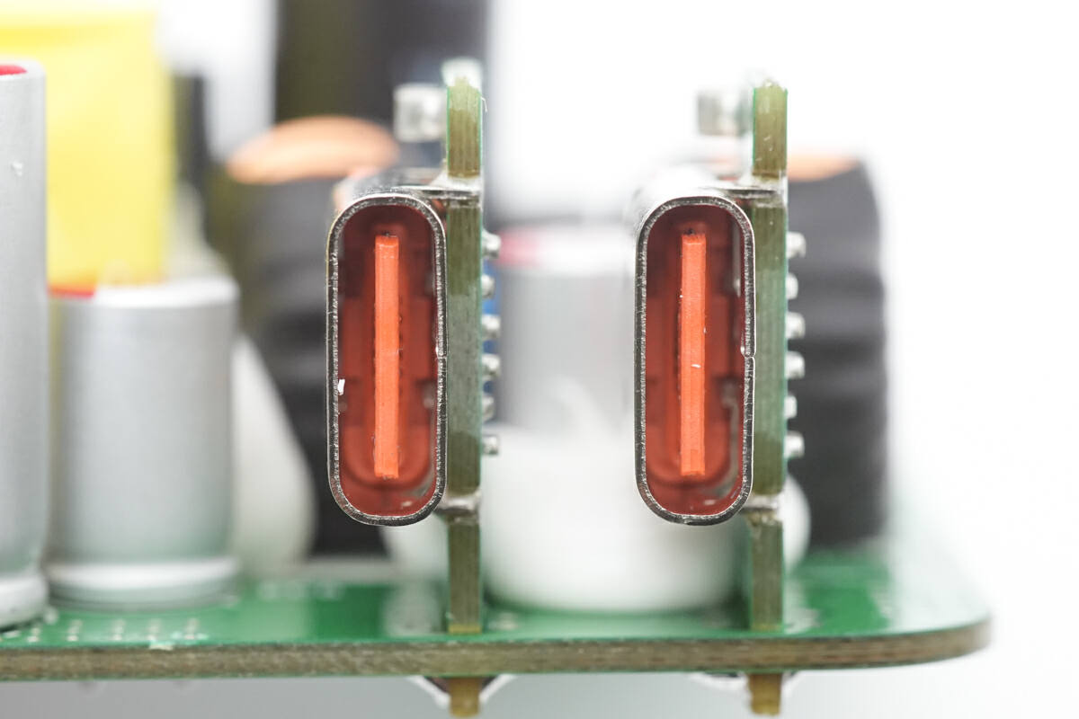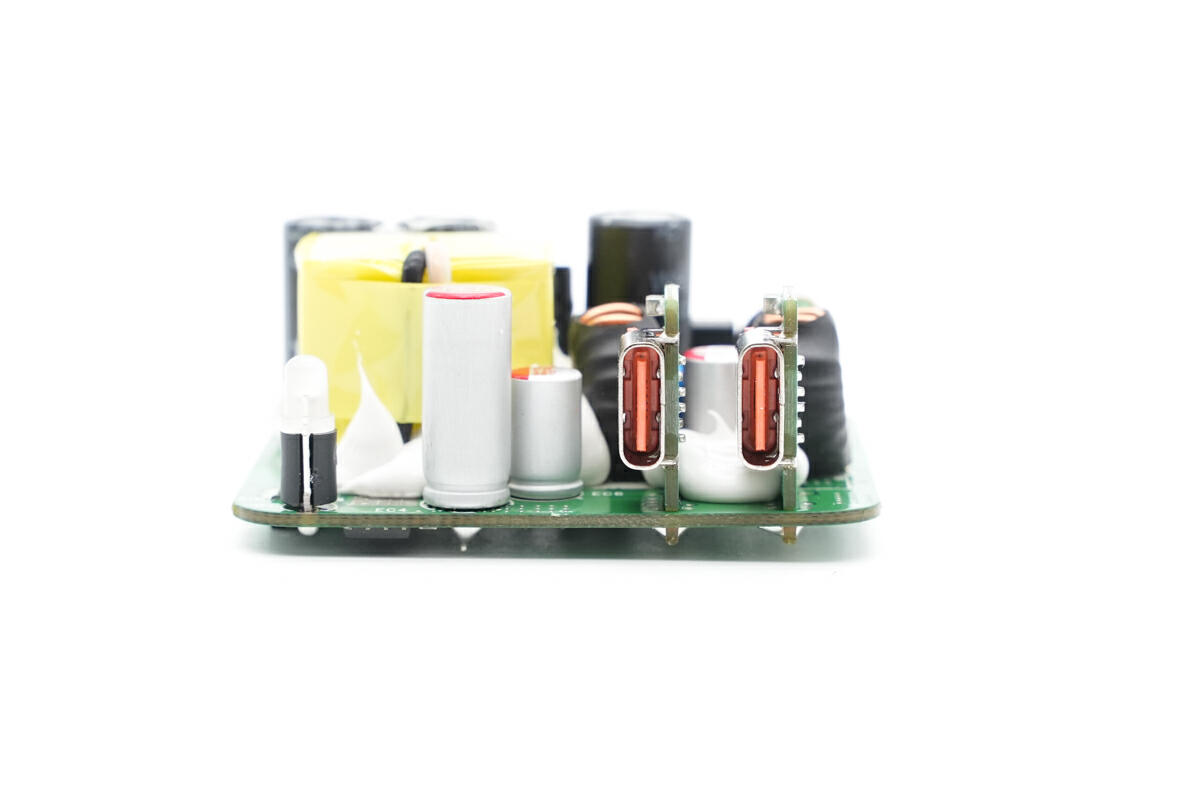 輸出側焊接濾波電容和輸出小板,USB-C母座焊接在垂直小板上。