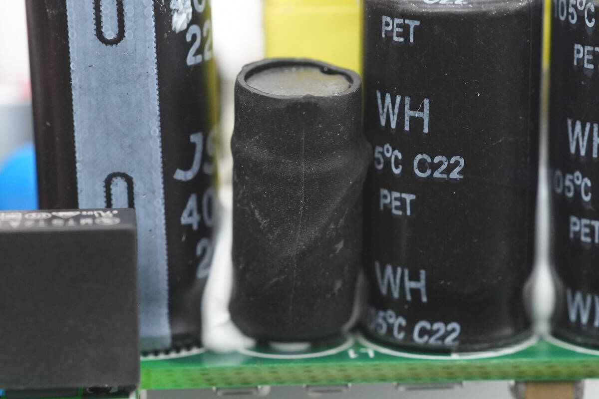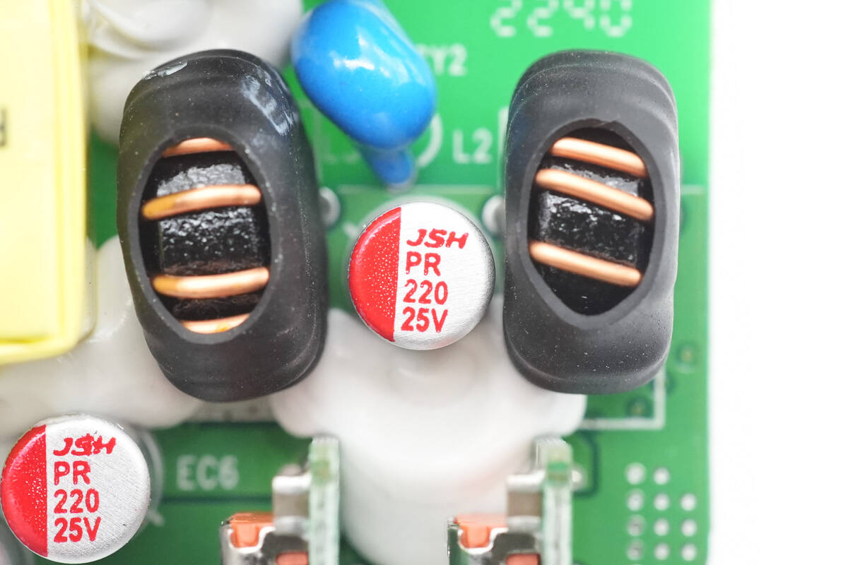 在兩顆降壓電感中間是輸出濾波電容,為萬京源PR系列固態(tài)電容,規(guī)格為220μF 25V。