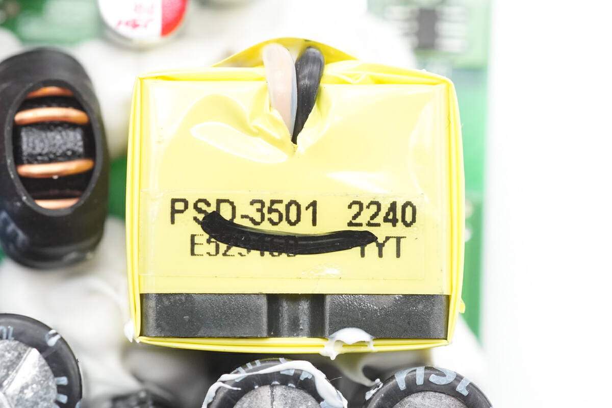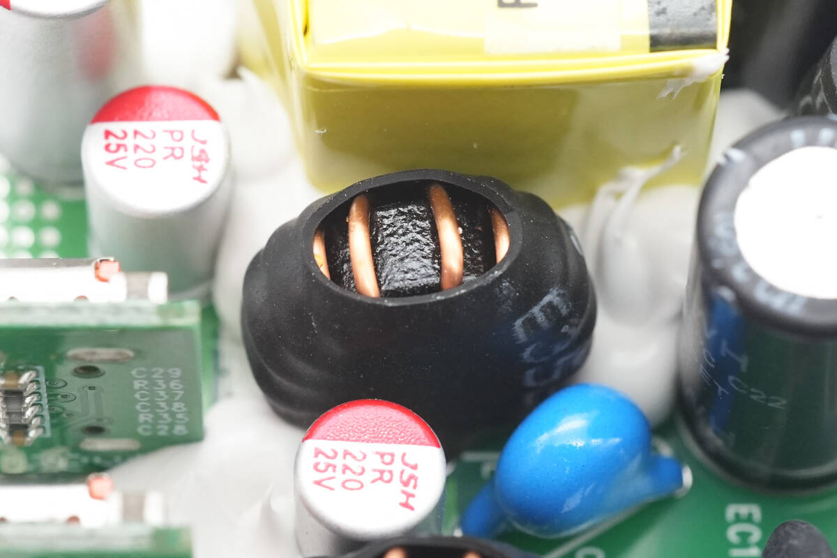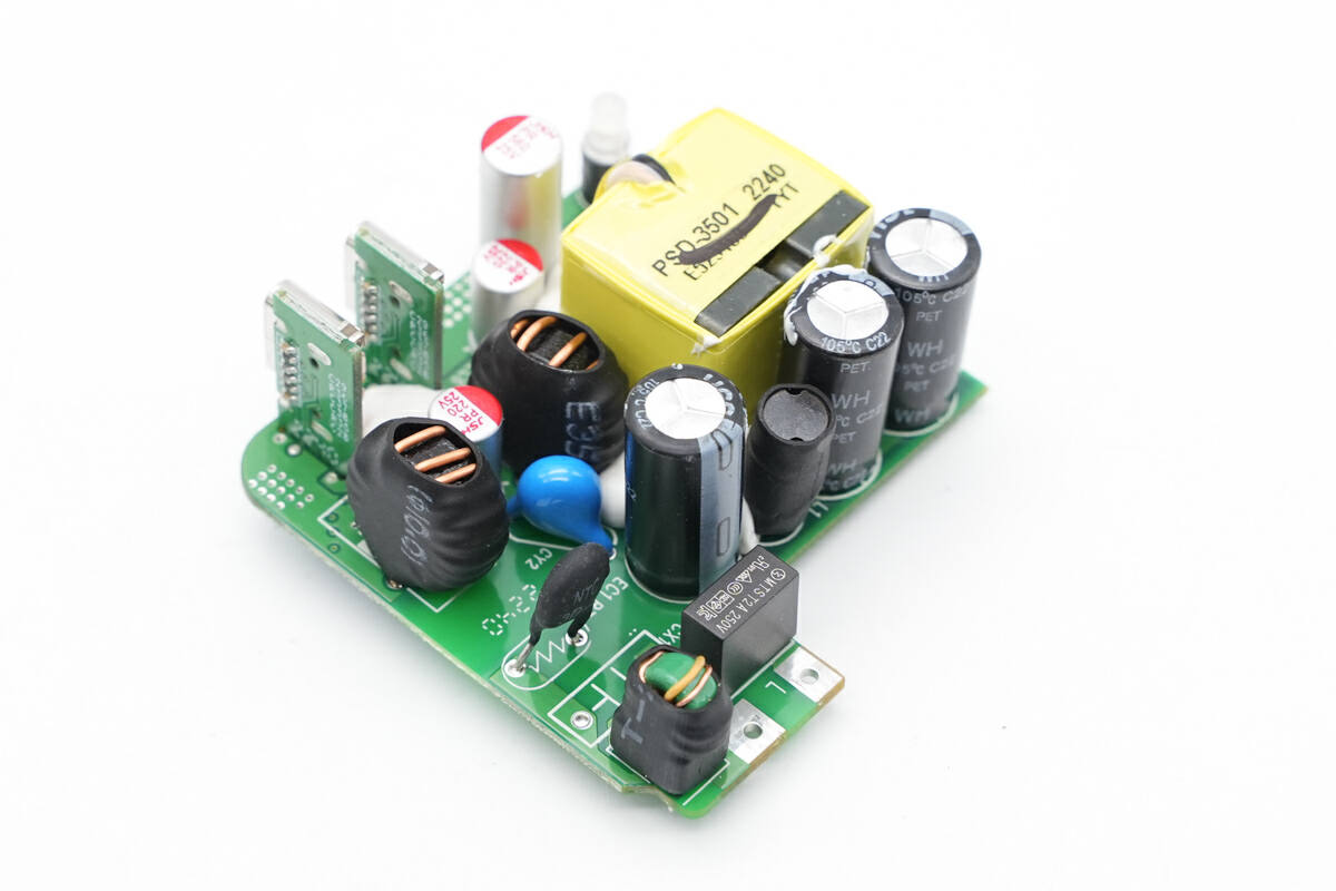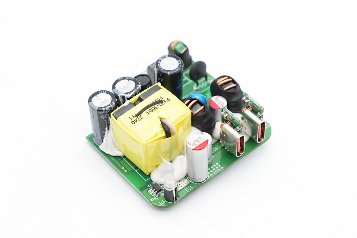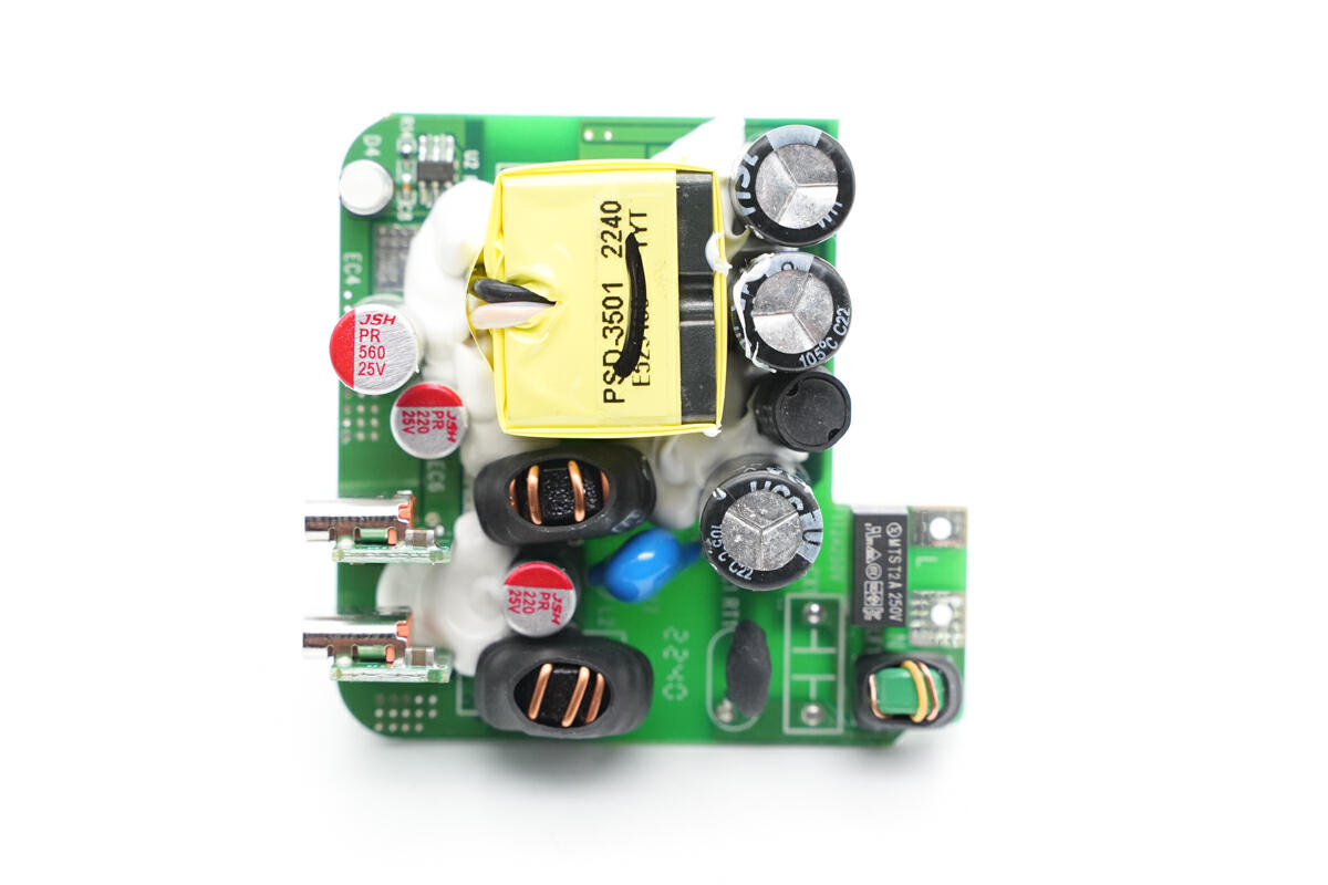PCBA模塊正面一覽,右下角焊接輸入端保險絲,共模電感,NTC熱敏電阻,右側上方焊接高壓濾波電容。左下角為USB-C接口降壓電路和濾波固態(tài)電容等元件,變壓器與電容之間通過白膠固定。