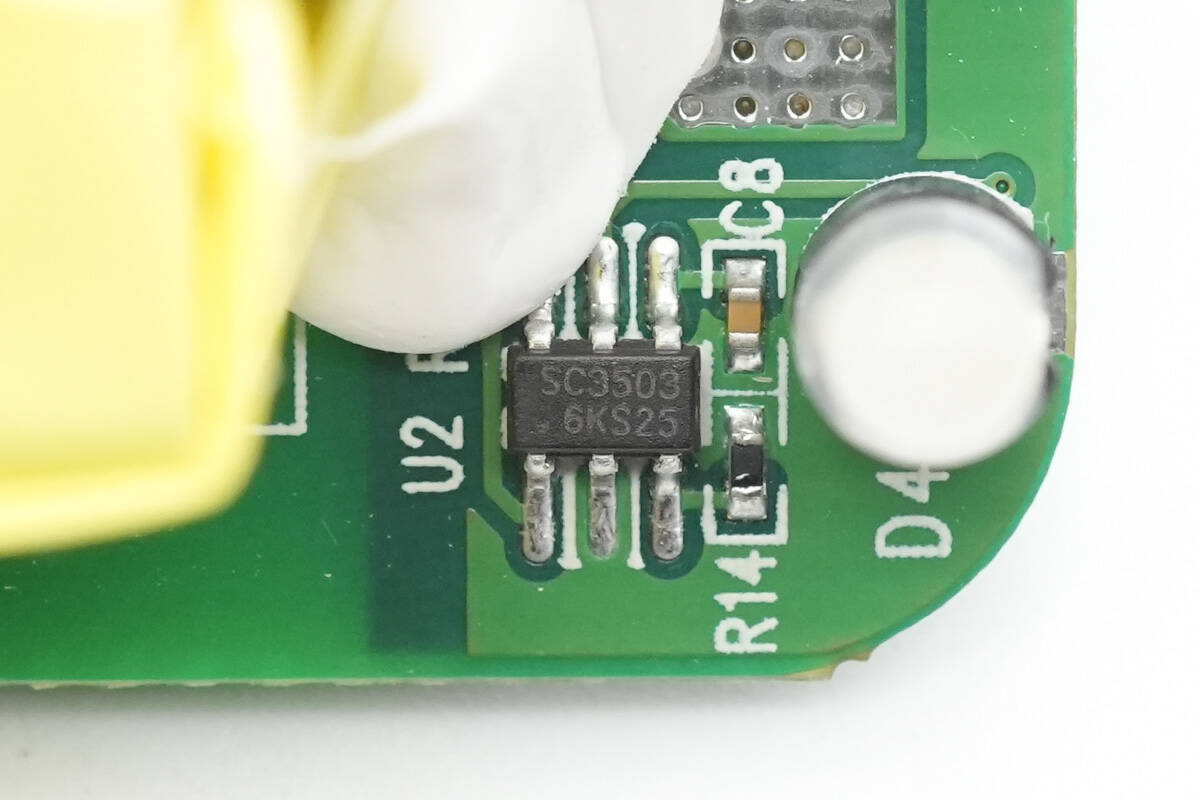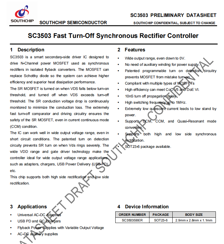 同步整流控制器采用南芯科技SC3503,這是一顆自適應開通檢測和快速關斷同步整流控制器,無需輔助線圈供電,輸出電壓最低可低至0V,專利的自適應開通檢測電路避免同步整流管誤開通,兼容多種MOS,具有超低的靜態(tài)電流,支持多種工作模式,支持高側和低側同步整流,外圍元件非常精簡。采用SOT23封裝,適用于寬范圍反激適配器應用。