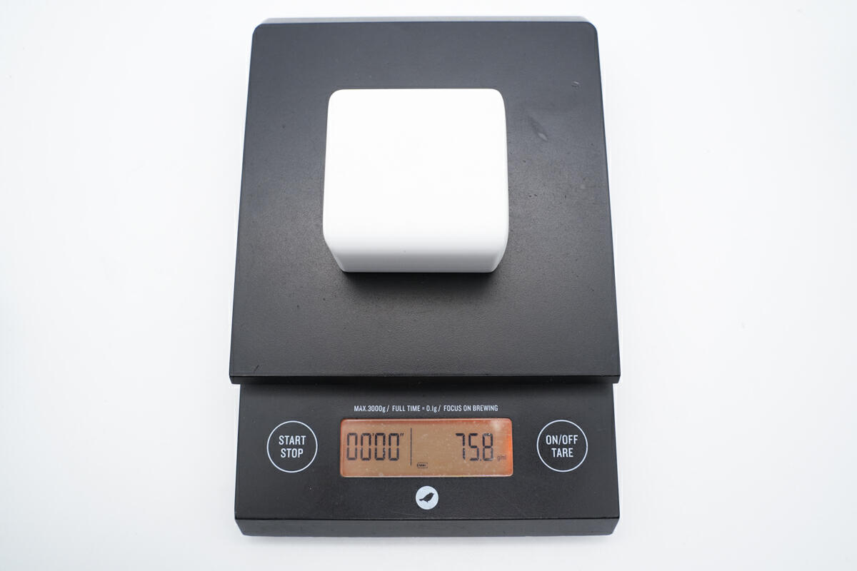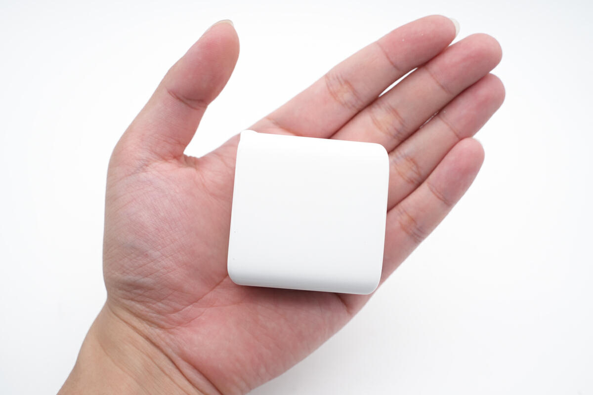 充電器為方塊造型,采用白色塑料外殼,表面磨砂抗指紋,通體白色使得整體看上去顯得十分簡約。