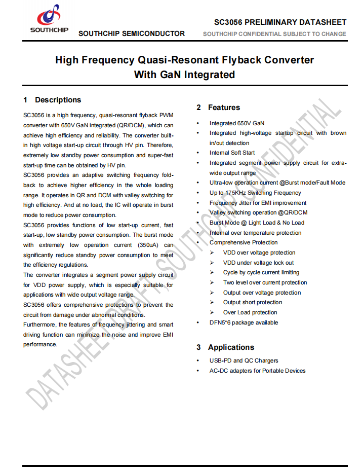 SC3056內(nèi)部集成軟啟動電路,以及用于超寬輸出范圍的分段式供電電路。在突發(fā)和故障模式下具有超低的工作電流,滿足待機能效要求。最高工作頻率為175KHz,大幅降低磁性器件的體積和成本。全功率范圍具備抖頻功能,用以改善EMI性能。