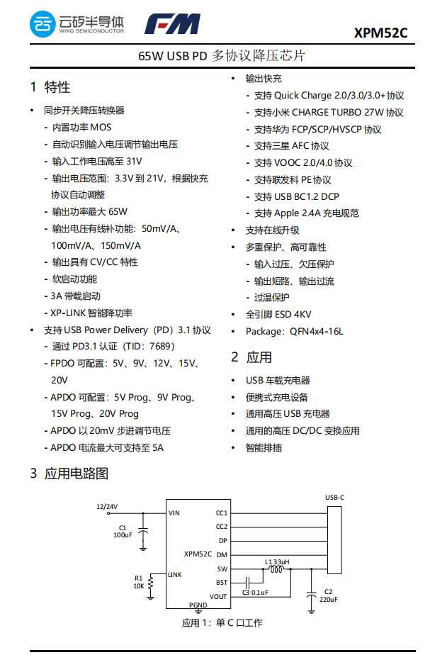 輸出采用富滿云矽XPM52C內(nèi)置協(xié)議功能的降壓轉換器,進行降壓輸出。XPM52C內(nèi)置降壓開關管和協(xié)議功能,支持根據(jù)輸入電壓調節(jié)輸出電壓,支持65W輸出,內(nèi)置多種快充協(xié)議,支持多口應用智能降低輸出功率,芯片內(nèi)置完善的保護功能,適用于車充和快充以及插排應用,采用QFN4*4-16封裝。