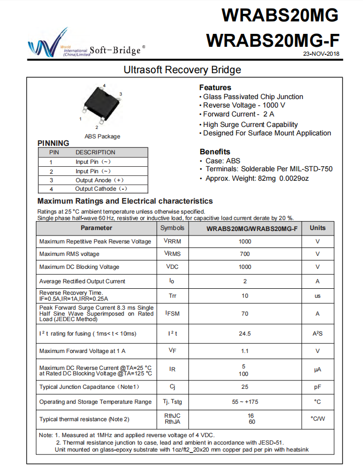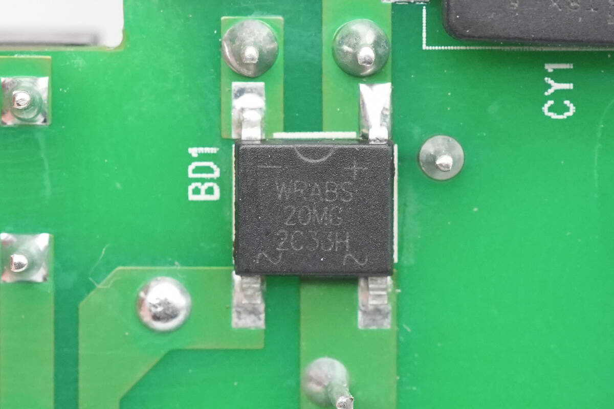 整流橋來自深圳市沃爾德實業(yè)有限公司,型號WRABS20MG,是一顆具有高浪涌能力的軟橋,這顆軟橋具有更高浪涌特性和較軟的恢復曲線,比較平滑的關斷特性,可以降低二極管結電容達到非常少的諧波振蕩產(chǎn)生的效果。