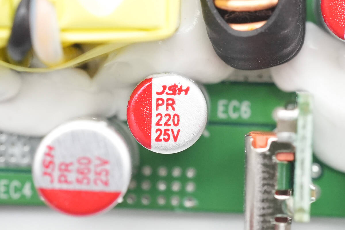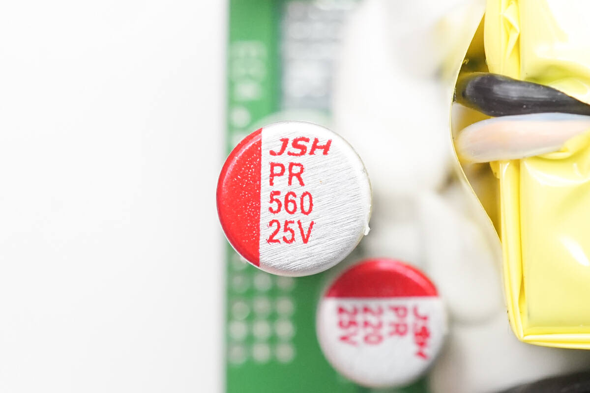 輸出濾波電容來自JSH萬京源,為PR系列固態(tài)電容,規(guī)格為560μF 25V。