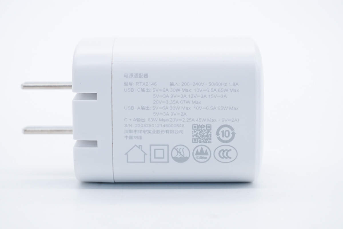 真我推出的這款67W氮化鎵充電器采用白色機(jī)身,配合折疊插腳涉及,便攜好用。充電器USB-C口支持67W PD快充和PPS快充,USB-A口支持OPPO私有65W快充,兩個(gè)接口均可滿足OPPO手機(jī)快充,同時(shí)USB-C接口支持對(duì)筆記本電腦充電,兼容性還是不錯(cuò)的。