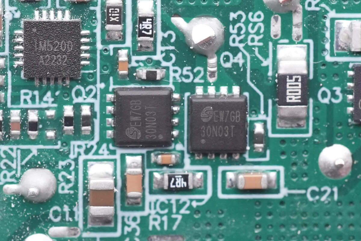 兩顆同步降壓開關(guān)管來(lái)自美浦森,型號(hào)SLN30N03T,是一顆耐壓30V的NMOS,導(dǎo)阻為6mΩ,采用DFN3*3封裝。
