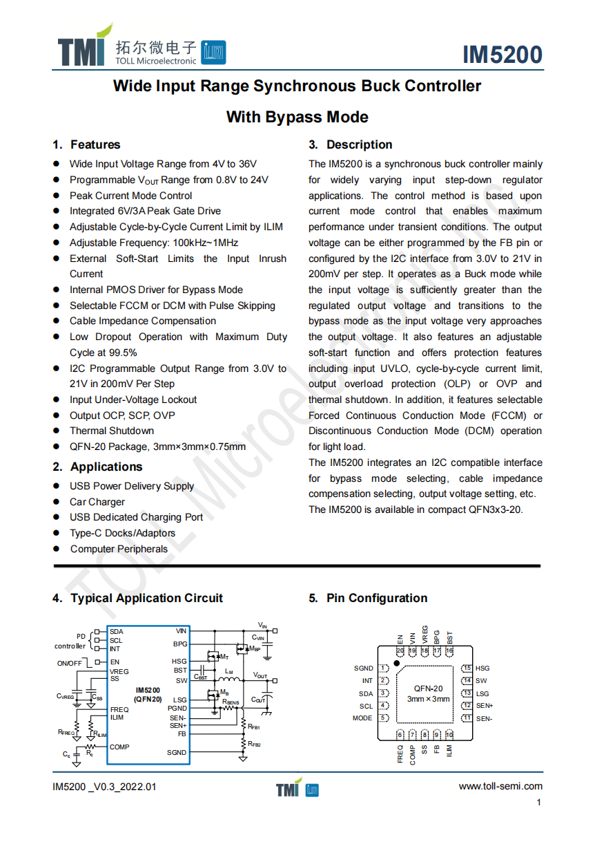 小板背面焊接同步降壓轉(zhuǎn)換器,來(lái)自拓爾微,型號(hào)IM5200,是一款同步高效buck控制器,主要用于寬輸入的buck應(yīng)用。其控制方式為峰值電流控制模式,可在瞬態(tài)條件下實(shí)現(xiàn)最優(yōu)性能。輸出電壓支持電阻分壓設(shè)置和I2C配置,芯片支持多種保護(hù)功能。
