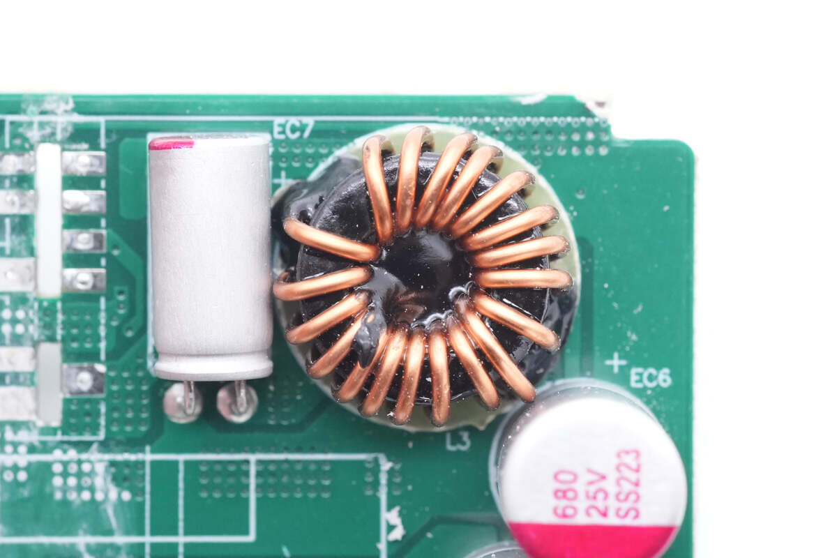 小板正面焊接三顆固態(tài)電容和磁環(huán)降壓電感。