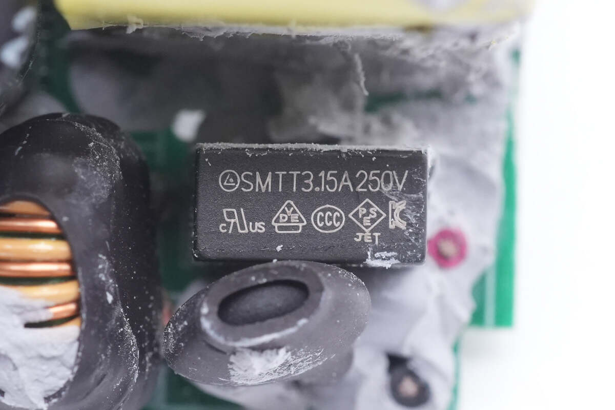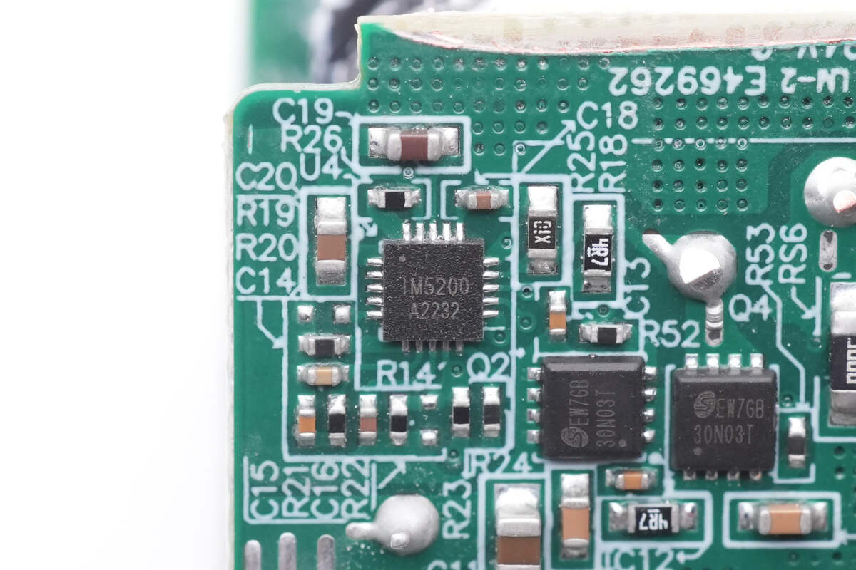 通過(guò)對(duì)PCBA模塊的觀察發(fā)現(xiàn),這款充電器采用QR開關(guān)電源設(shè)計(jì),寬電壓范圍輸出,輸出電壓由協(xié)議芯片控制,通過(guò)光耦反饋,實(shí)現(xiàn)寬范圍電壓輸出。USB-A口通過(guò)降壓芯片,實(shí)現(xiàn)降壓輸出。下面我們就從輸入端開始了解各個(gè)元器件的信息。
