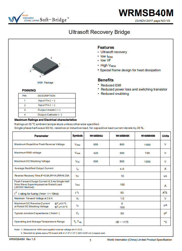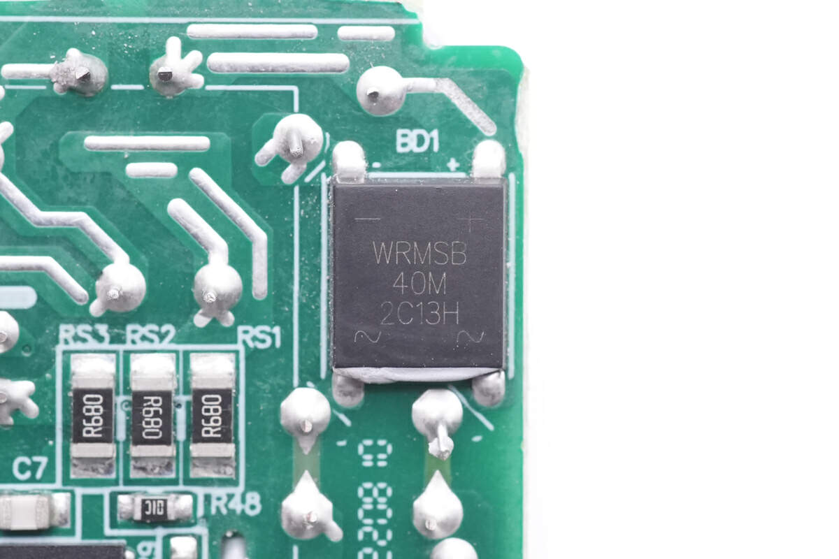 輸入端WRMSB40M整流橋來(lái)自深圳市沃爾德實(shí)業(yè)有限公司,規(guī)格為4A 1000V。WRMSB40M這顆軟橋通過(guò)較軟的恢復(fù)曲線,比較平滑的關(guān)斷特性,可以降低二極管結(jié)電容達(dá)到非常少的諧波振蕩產(chǎn)生的效果。