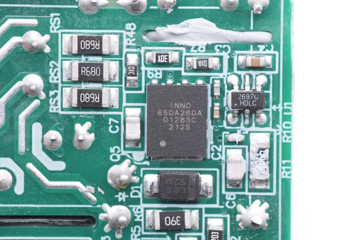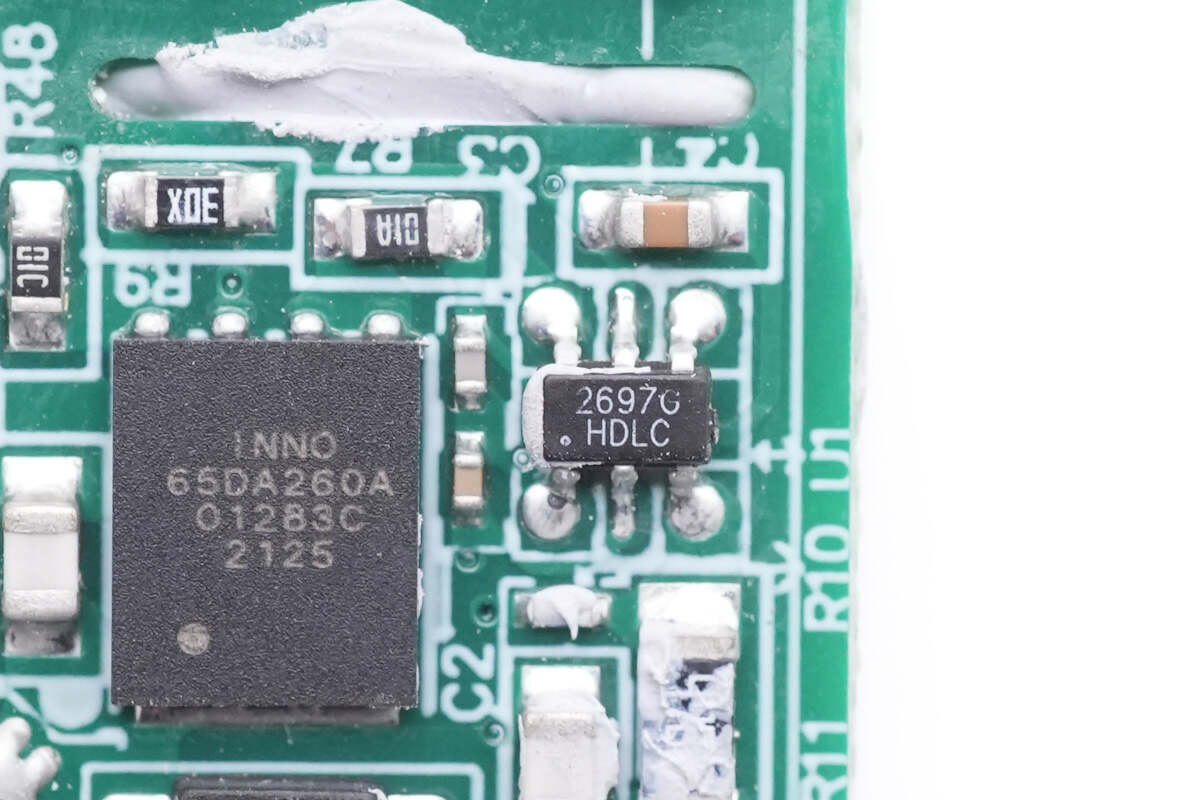 開關(guān)管來(lái)自英諾賽科,型號(hào)為INN650DA260A,這是一顆高性價(jià)比、耐壓650V的氮化鎵高壓?jiǎn)喂埽矐B(tài)耐壓750V,得益于工藝改進(jìn),性能有明顯的提升,適用于65-120W的反激架構(gòu),120-200W的LLC架構(gòu)。