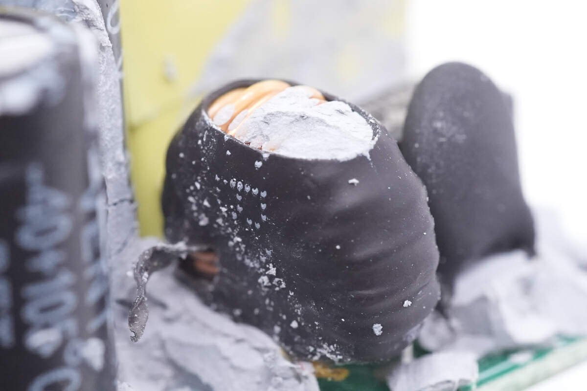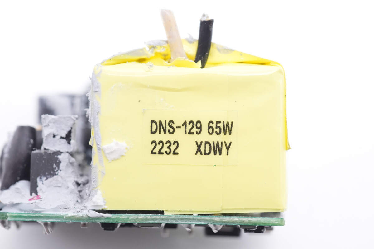 變壓器標(biāo)注65W功率,嚴(yán)密纏繞膠帶絕緣。