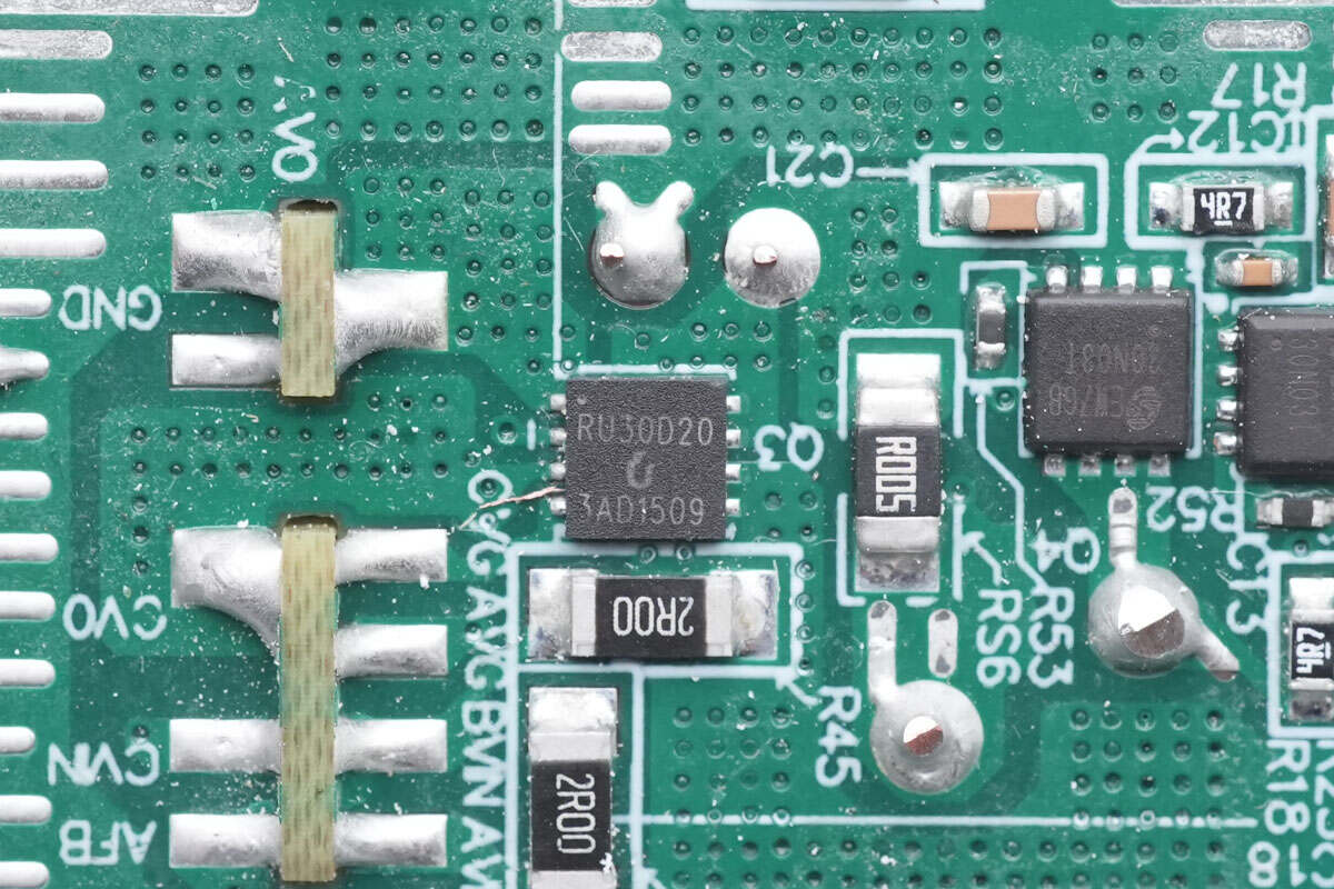 輸出VBUS開關(guān)管來(lái)自銳駿半導(dǎo)體,型號(hào)RU30D20,是一顆雙NMOS,耐壓30V,導(dǎo)阻8.5mΩ,使用PDFN3333封裝。