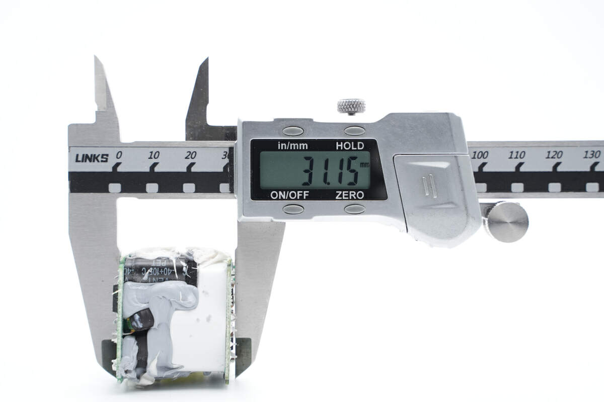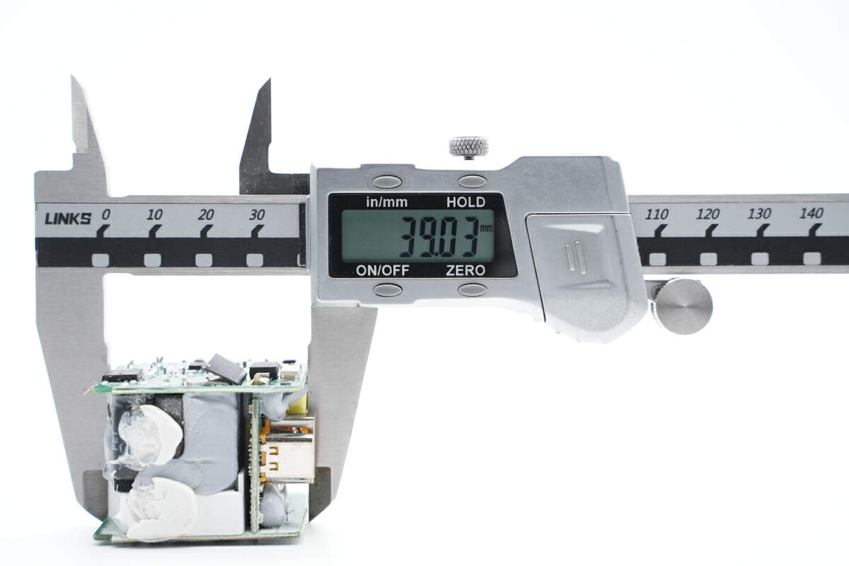 使用游標(biāo)卡尺測(cè)得PCBA模塊長(zhǎng)度約為39.03mm。