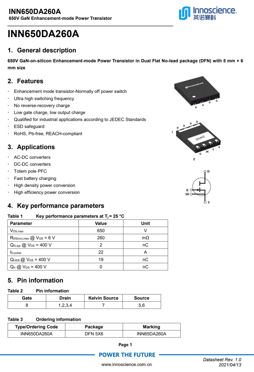 INN650DA260A支持超高開關(guān)頻率,無(wú)反向恢復(fù)電荷,具有極低的柵極電荷和輸出電荷,符合JEDEC標(biāo)準(zhǔn)的工業(yè)應(yīng)用要求,內(nèi)置ESD保護(hù),符合RoHS、無(wú)鉛、歐盟REACH法規(guī)。