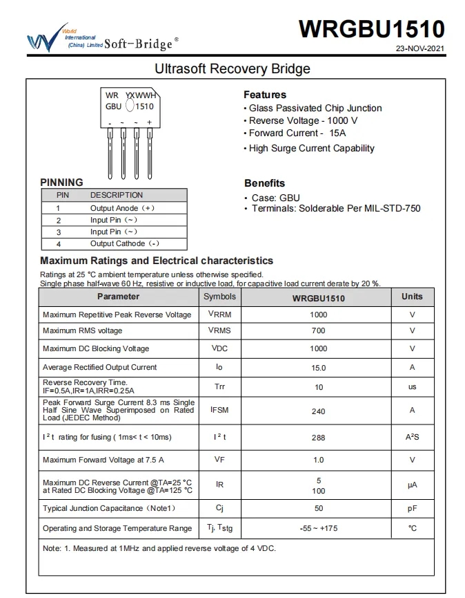 LOW VF整流橋產(chǎn)品是由四只低壓降整流硅芯片作橋式連接,有四個(gè)引出腳。兩只二極管負(fù)極的連接點(diǎn)是全橋直流輸出端的“正極”,兩只二極管正極的連接點(diǎn)是全橋直流輸出端的“負(fù)極”,外用絕緣塑封而成。LOW VF即是正向壓降極低的整流橋。