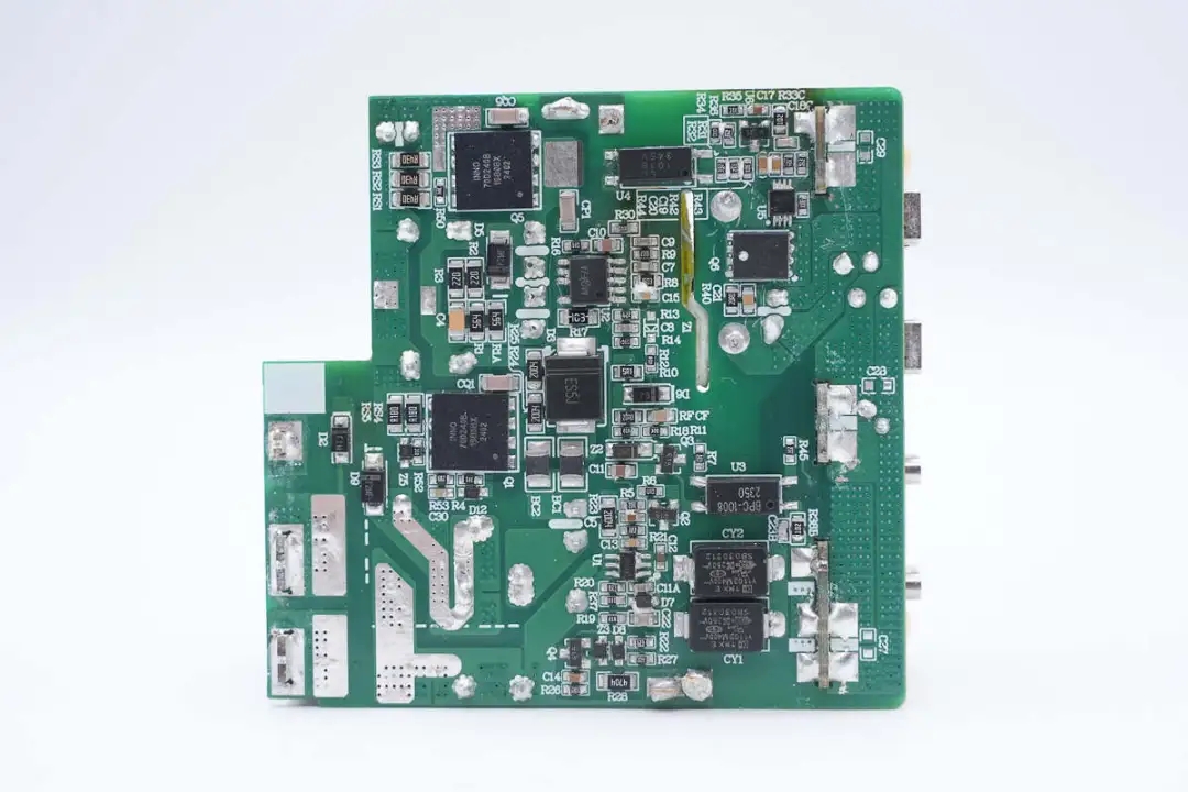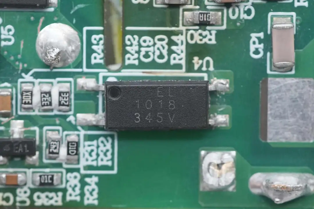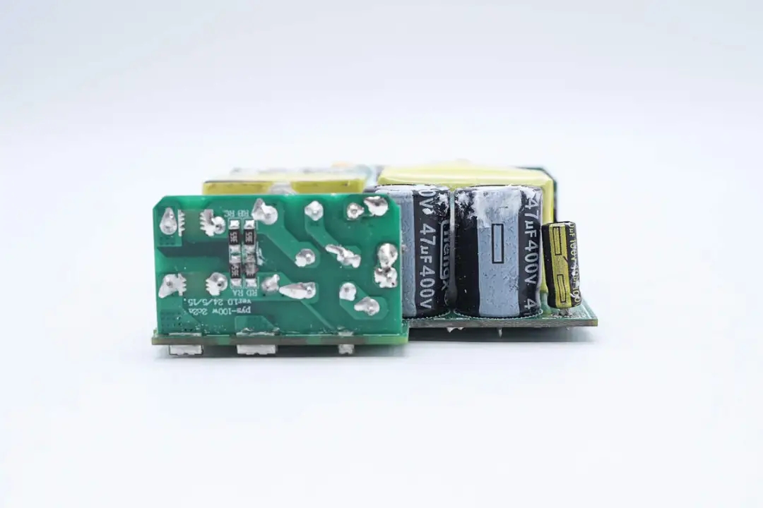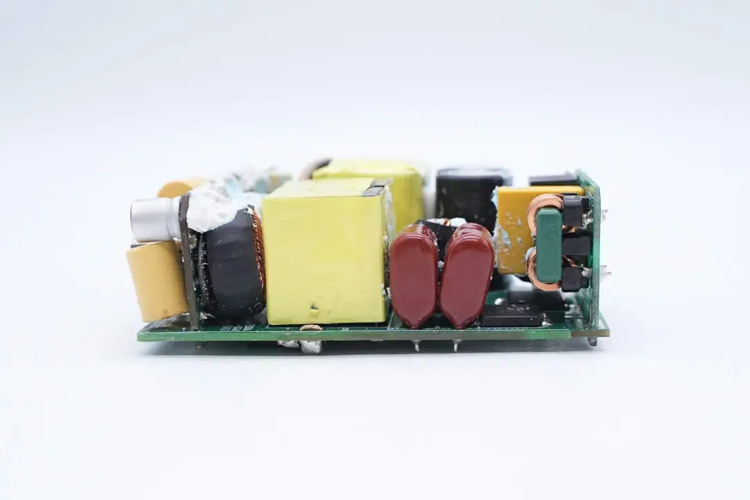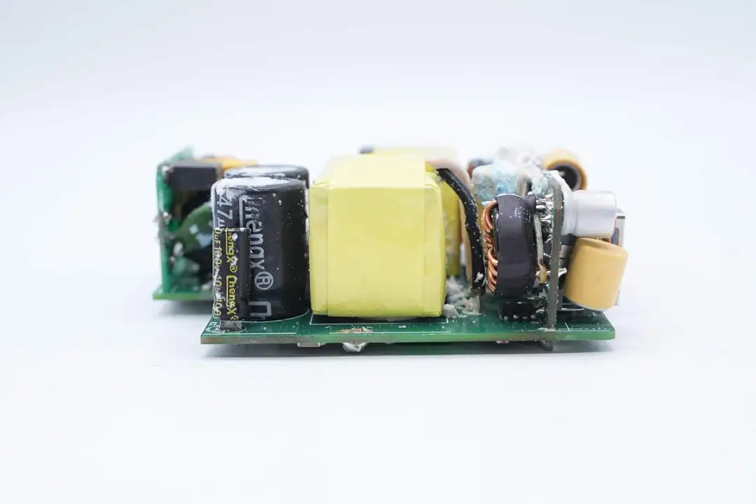 主板另一側(cè)設(shè)有高壓濾波電解電容、主控芯片供電電容、變壓器以及輸出濾波固態(tài)電容。