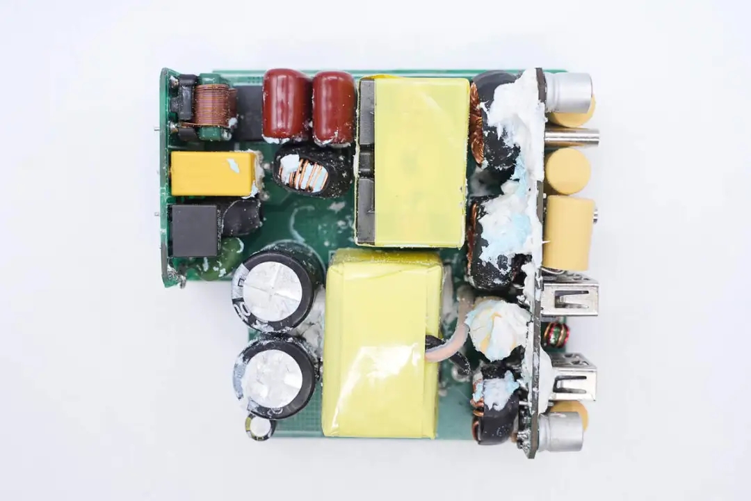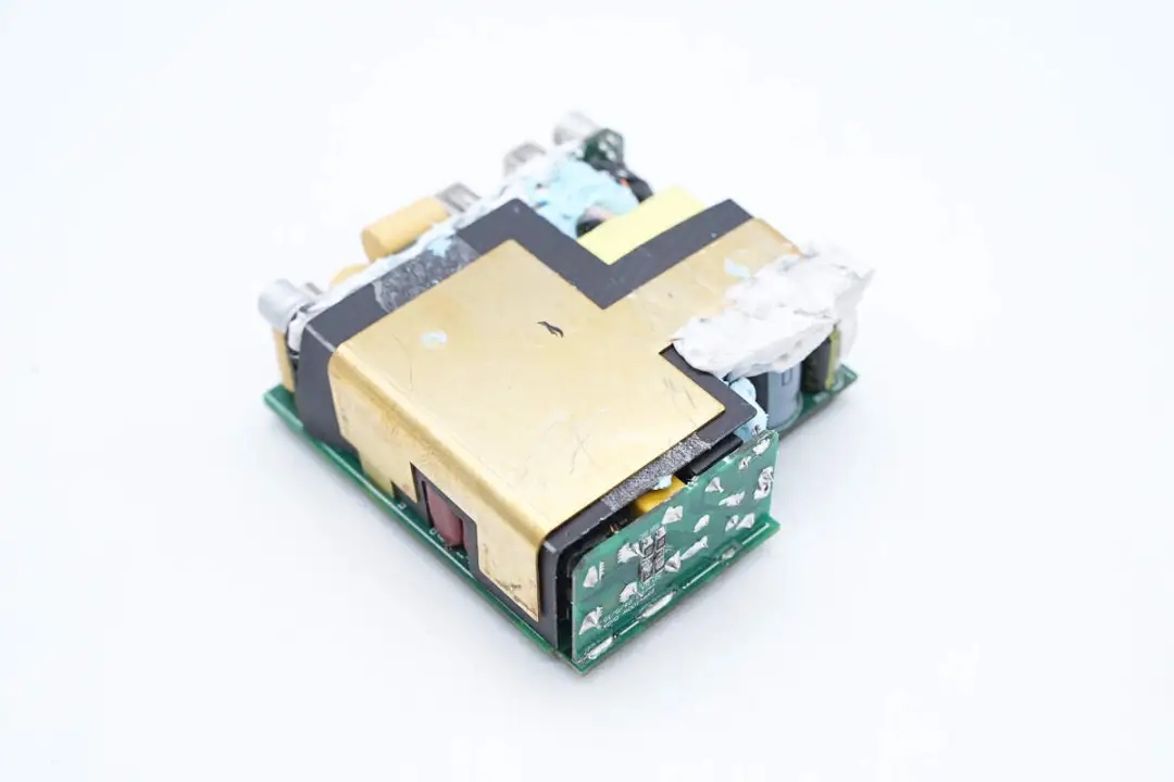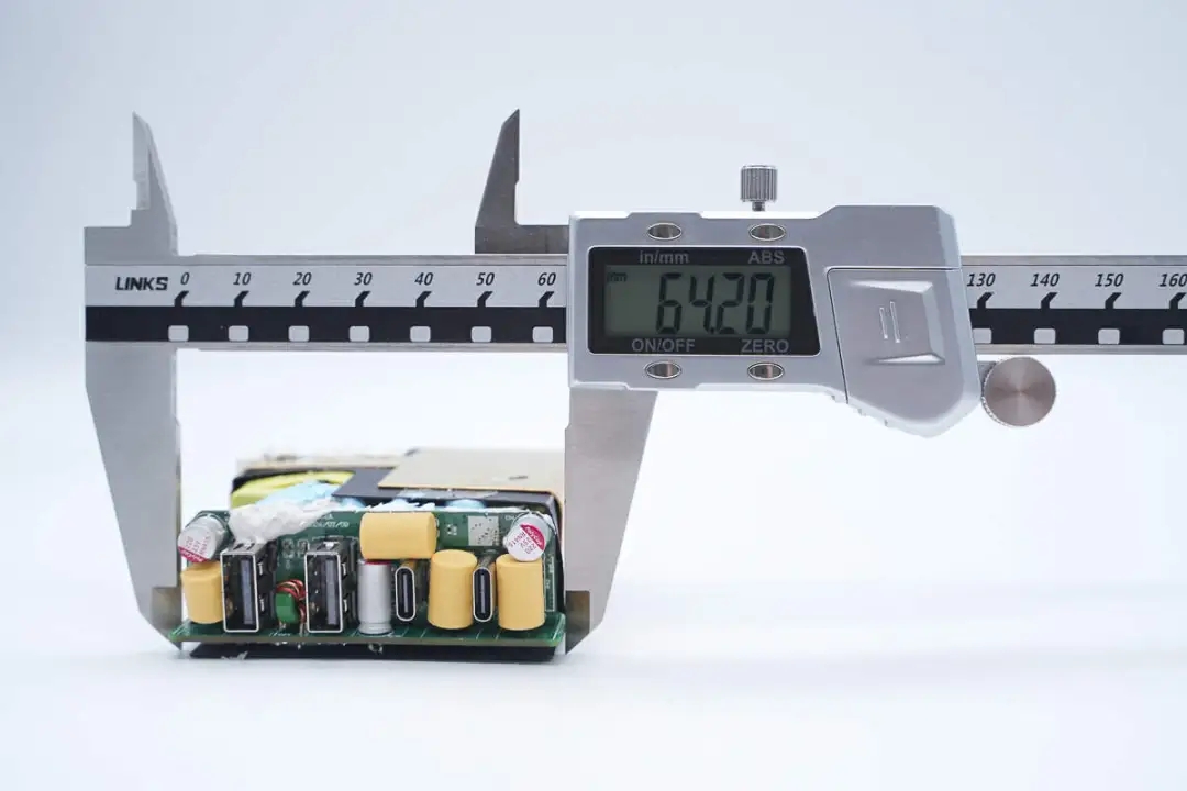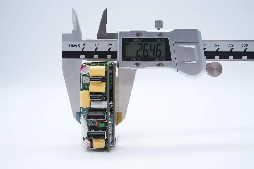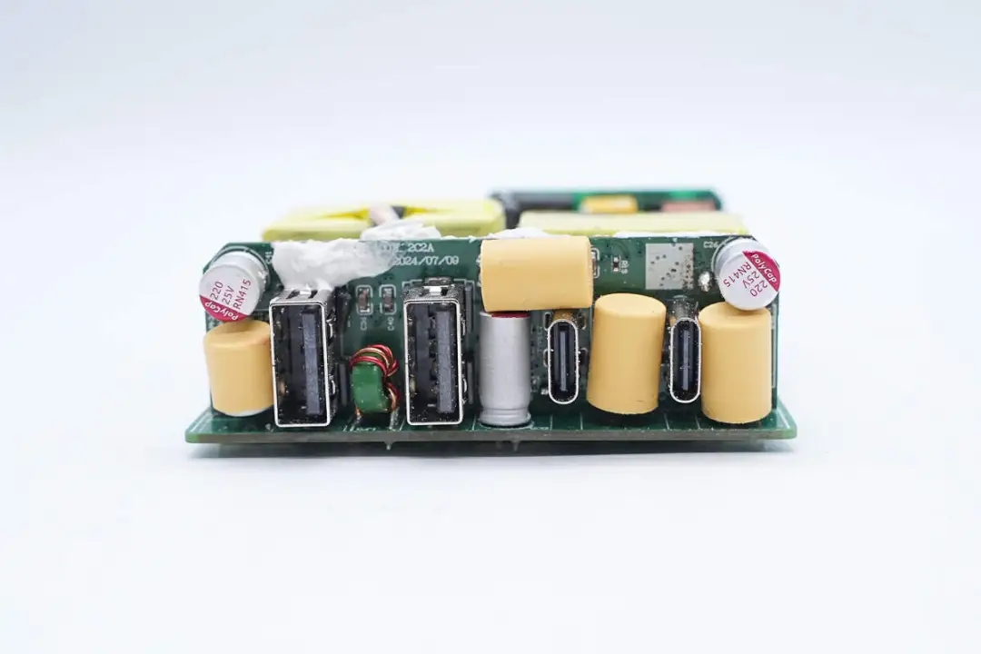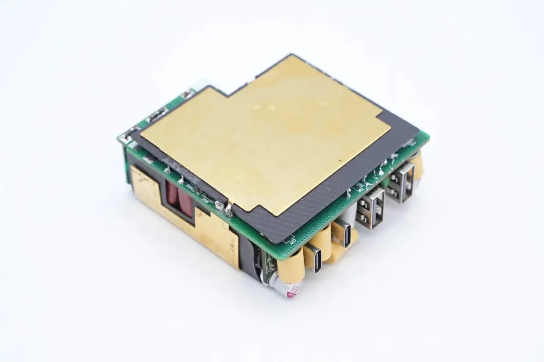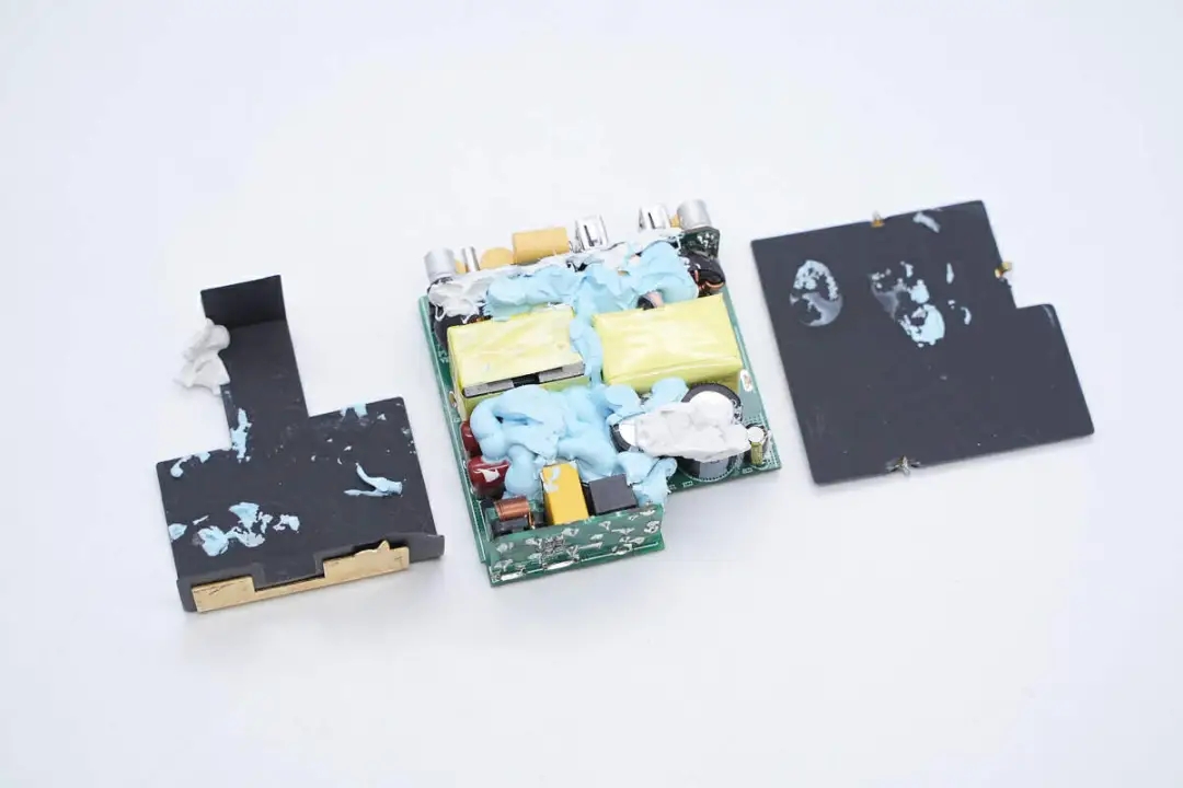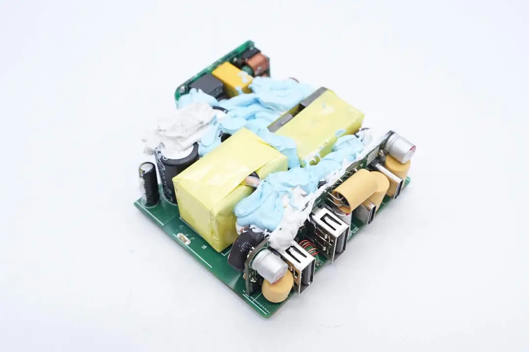 三路二次降壓電路同步降壓控制器均使用的英集芯IP6550,并使用英集芯IP2738和IP2726兩顆協(xié)議芯片分別控制四個(gè)接口輸出。采用承興電解電容以及柏瑞凱固態(tài)電容進(jìn)行濾波,PCBA模塊填充導(dǎo)熱膠以及覆蓋散熱片幫助散熱,此外絕緣設(shè)計(jì)做的也很到位。
