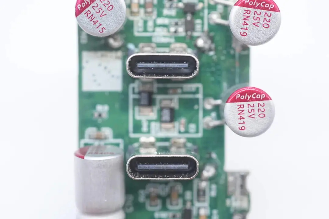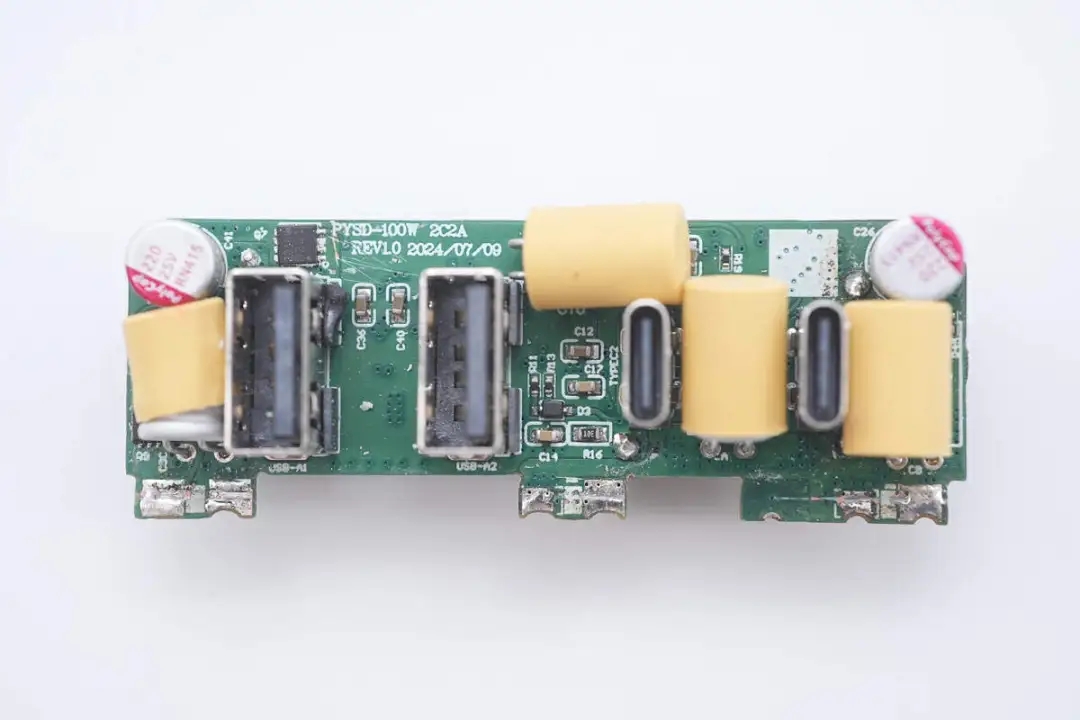 將小板拆下,正面設(shè)有多顆濾波固態(tài)電容以及USB-A1口輸出VBUS開(kāi)關(guān)管,其中四顆濾波固態(tài)電容還套有膠套保護(hù)。