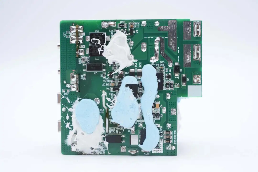 PCBA模塊正面器件間的縫隙填充藍(lán)、白膠幫助導(dǎo)熱和加固,設(shè)計(jì)合理。