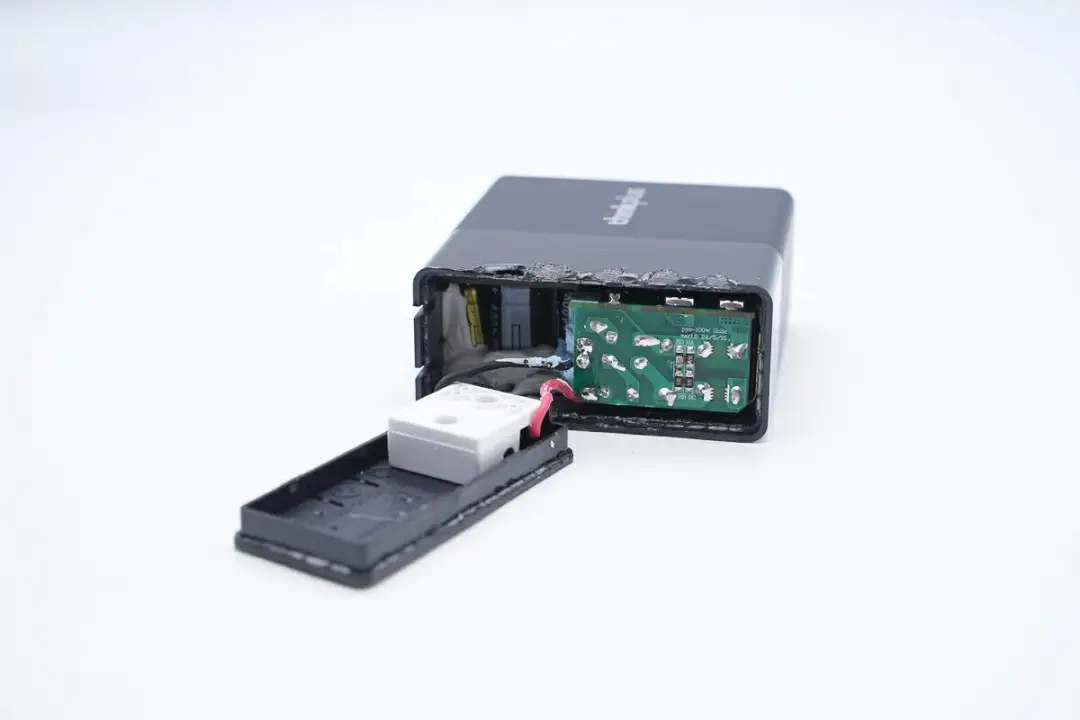 將充電器輸入端外殼拆開(kāi),插腳采用白色塑料板以及螺絲固定,通過(guò)導(dǎo)線連接PCBA模塊通電。