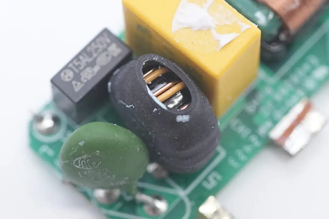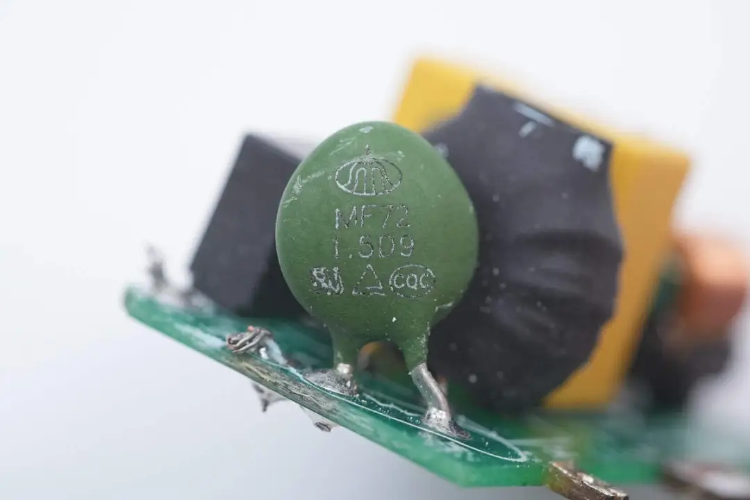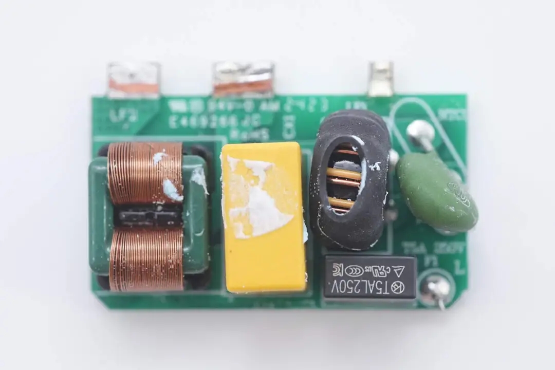 將小板拆下,板子正面設(shè)有延時(shí)保險(xiǎn)絲、NTC熱敏電阻、安規(guī)X2電容以及兩級(jí)共模電感。