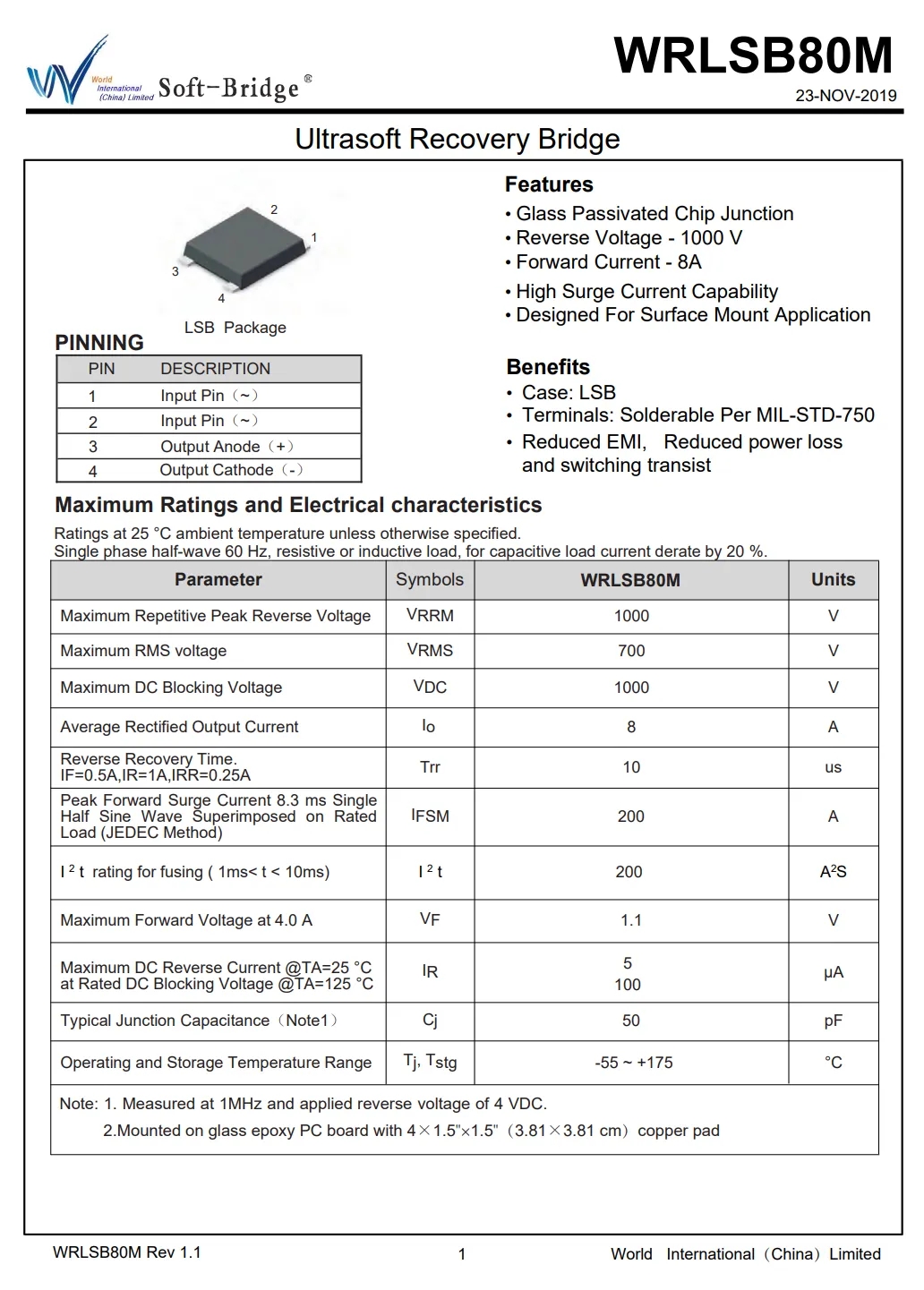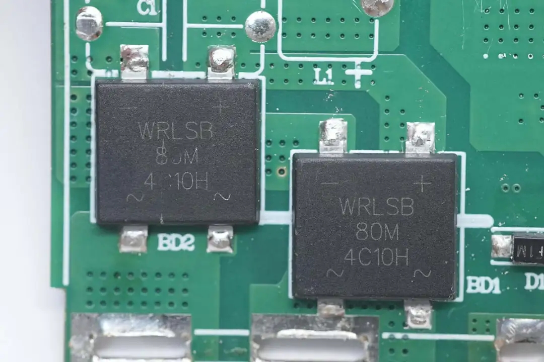 整流橋來(lái)自深圳市沃爾德實(shí)業(yè)有限公司,型號(hào)WRLSB80M,這顆軟橋通過(guò)較軟的恢復(fù)曲線,比較平滑的關(guān)斷特性,可以降低二極管結(jié)電容達(dá)到非常少的諧波振蕩產(chǎn)生的效果。選用的LSB封裝,擁有良好的散熱特性,幫助中大瓦數(shù)適配器提升可靠性,單顆可做60W+。