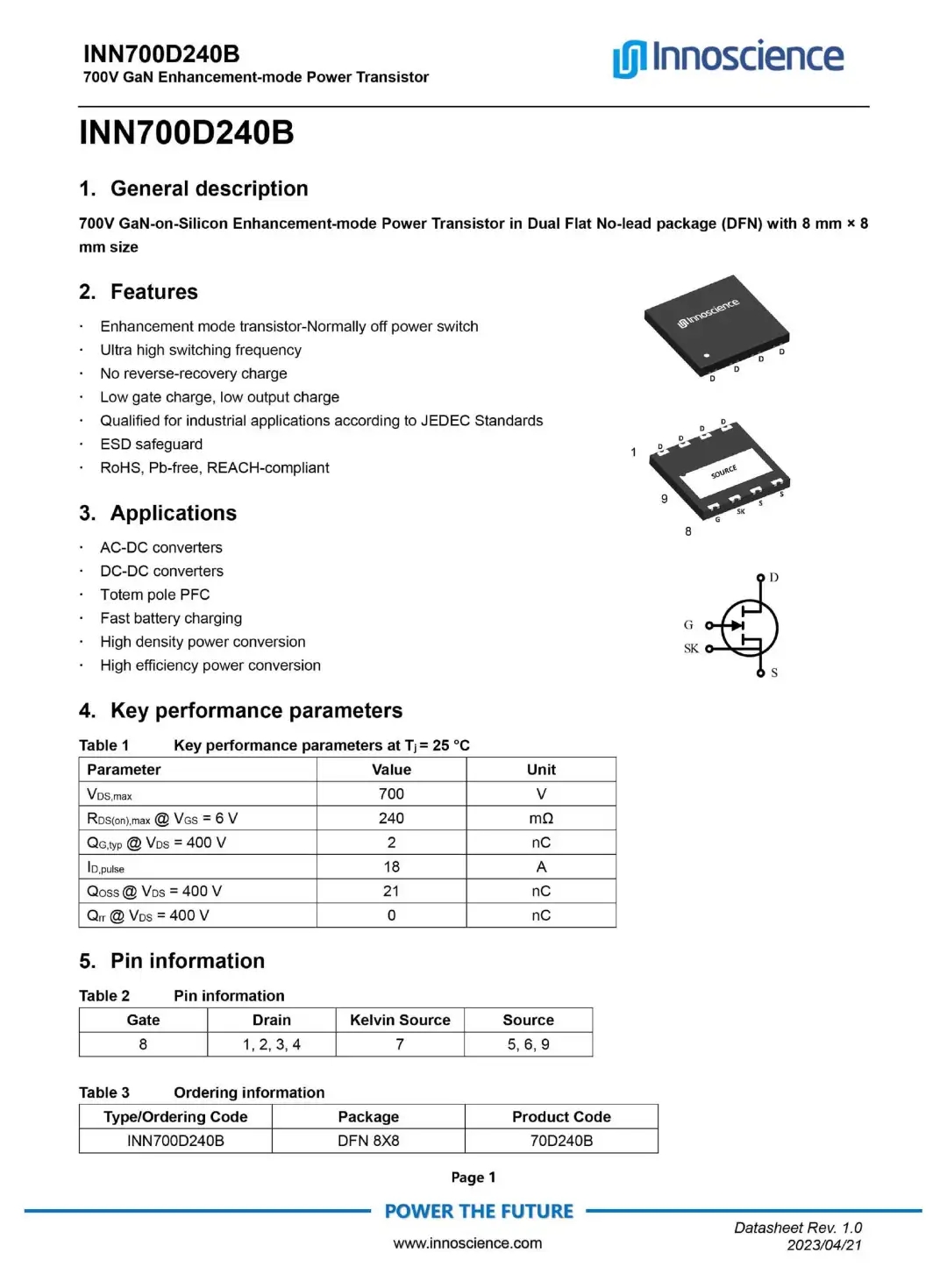 PFC升壓開(kāi)關(guān)管采用英諾賽科INN700D240B,是一顆耐壓700V的增強(qiáng)型氮化鎵開(kāi)關(guān)管,瞬態(tài)耐壓為800V,導(dǎo)阻為240mΩ,符合JEDEC標(biāo)準(zhǔn)的工業(yè)應(yīng)用需求,內(nèi)置ESD保護(hù),采用DFN8*8封裝。