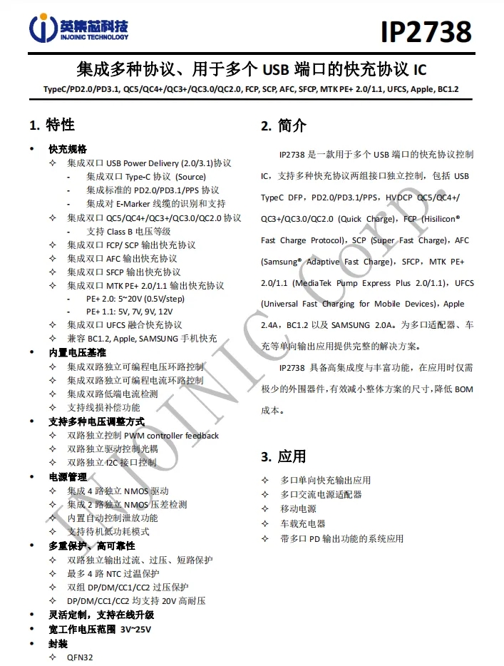 兩個(gè)USB-C接口的協(xié)議芯片來(lái)自英集芯,型號(hào)IP2738,是一顆雙路協(xié)議芯片,支持雙口18-140W快充應(yīng)用,具備獨(dú)立的反饋控制,具備獨(dú)立的USB PD控制,相當(dāng)于兩顆IP2736整合到一顆芯片內(nèi)部,快充規(guī)格與IP2736相同。支持USB PD3.1 28V EPR檔位,并支持PD3.0/PPS等豐富全面的快充協(xié)議,兼容性非常好。