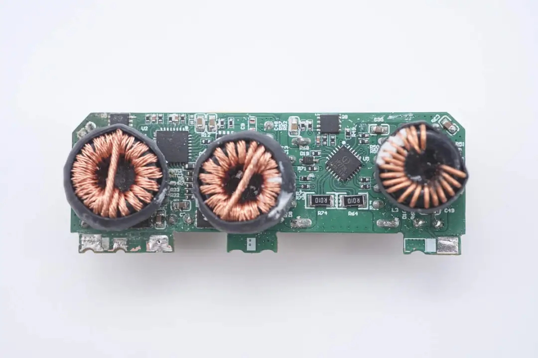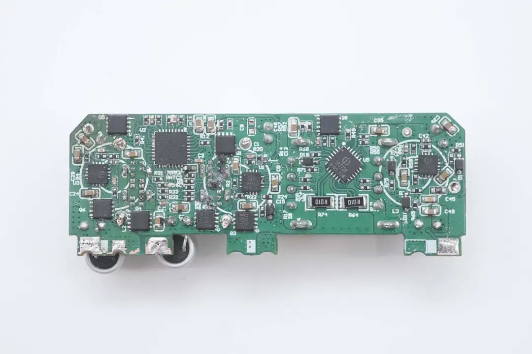 將三顆降壓電感拆掉,板子上設(shè)有三路降壓電路的同步降壓控制器、同步降壓開(kāi)關(guān)管、兩顆協(xié)議芯片以及輸出VBUS開(kāi)關(guān)管。