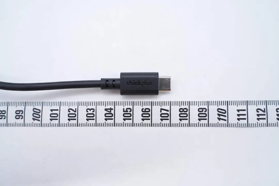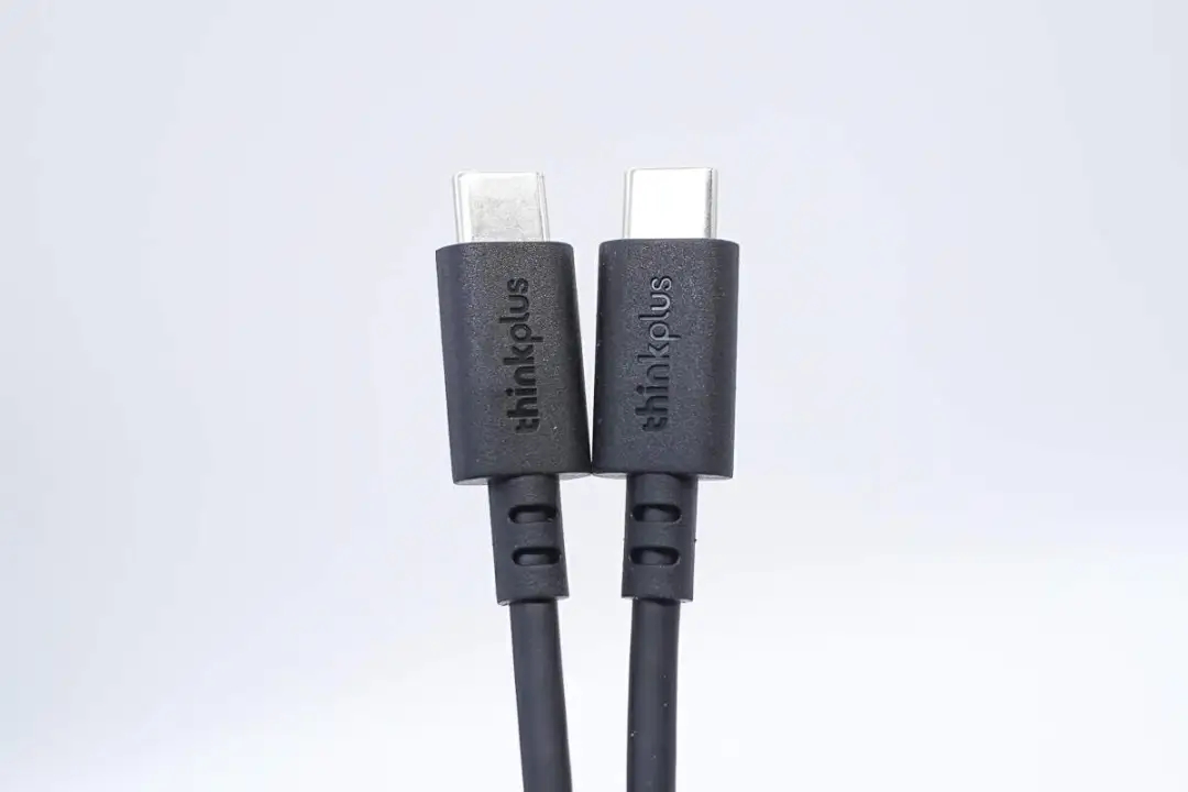 附帶數(shù)據(jù)線為USB-C to USB-C線,線頭外殼磨砂方便插拔,此外設(shè)計(jì)有thinkplus品牌。