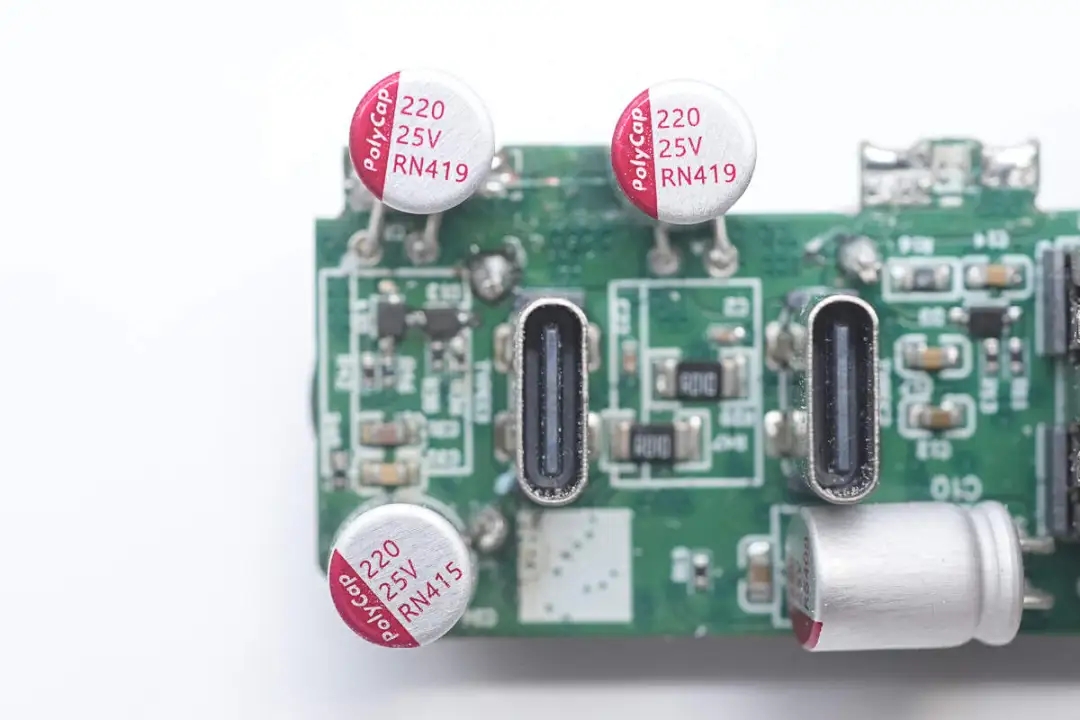 三顆濾波固態(tài)電容來(lái)自柏瑞凱,規(guī)格均為25V220μF,用于降壓輸出和接口輸出濾波。