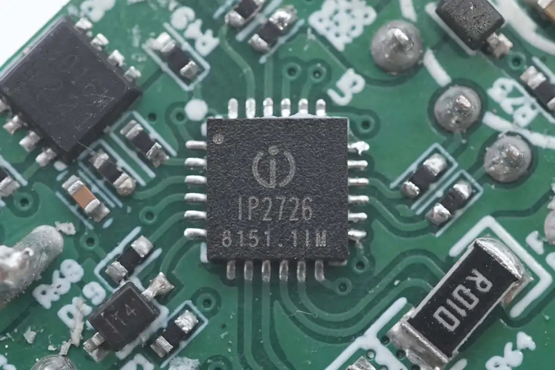 兩個(gè)USB-A口協(xié)議芯片來(lái)自英集芯,型號(hào)為IP2726,是一顆應(yīng)用非常廣泛的協(xié)議芯片。英集芯IP2726是一顆集成多種協(xié)議、用于USB輸出端口的快充IC,支持Type-C DFP、PD2.0/3.0、PPS、QC4+、QC2.0/3.0、FCP、AFC、SCP、MTK PE+、Apple2.4A、BC1.2以及三星2A等協(xié)議。具有高集成度和豐富的功能,在應(yīng)用時(shí)僅需極少的外圍器件,有效減小整體方案的尺寸,降低BOM成本。