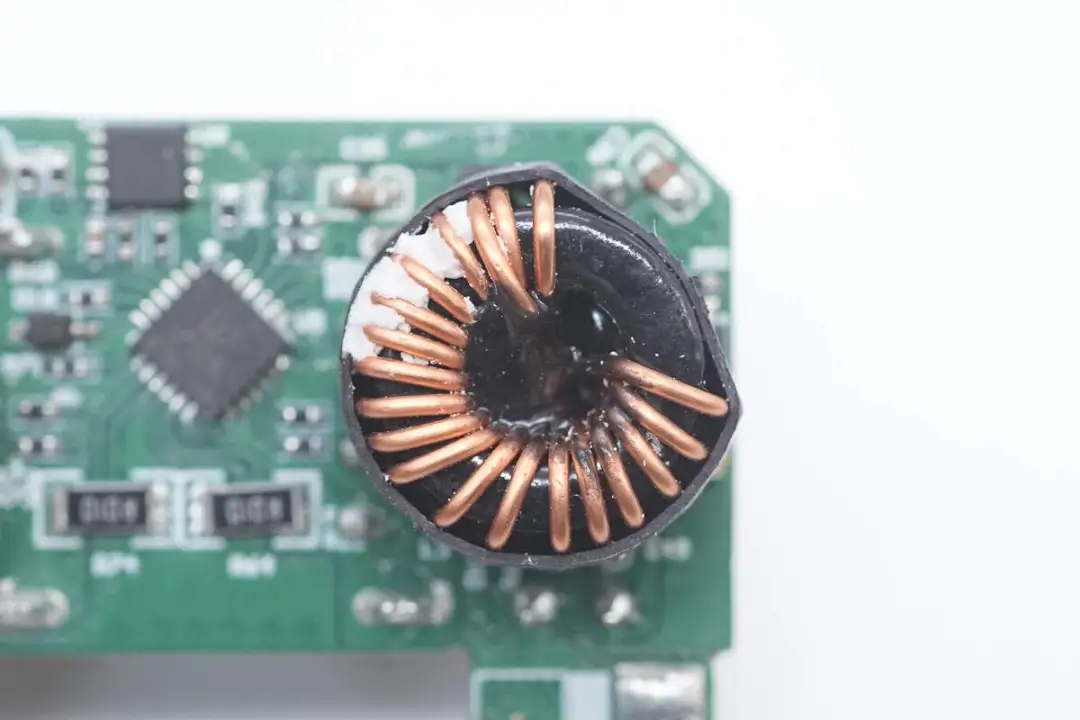對(duì)應(yīng)兩顆降壓電感特寫(xiě),采用多股漆包線繞制,外套熱縮管絕緣。
