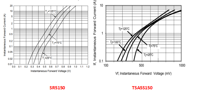 上圖的曲線和數(shù)據(jù)顯示,采用Trench工藝的肖特基二極管在相同電流的情況下比采用STD工藝的肖特基二極管的VF值要低,具有更精細的小電流、高開關(guān)速度和良好的線性特性。